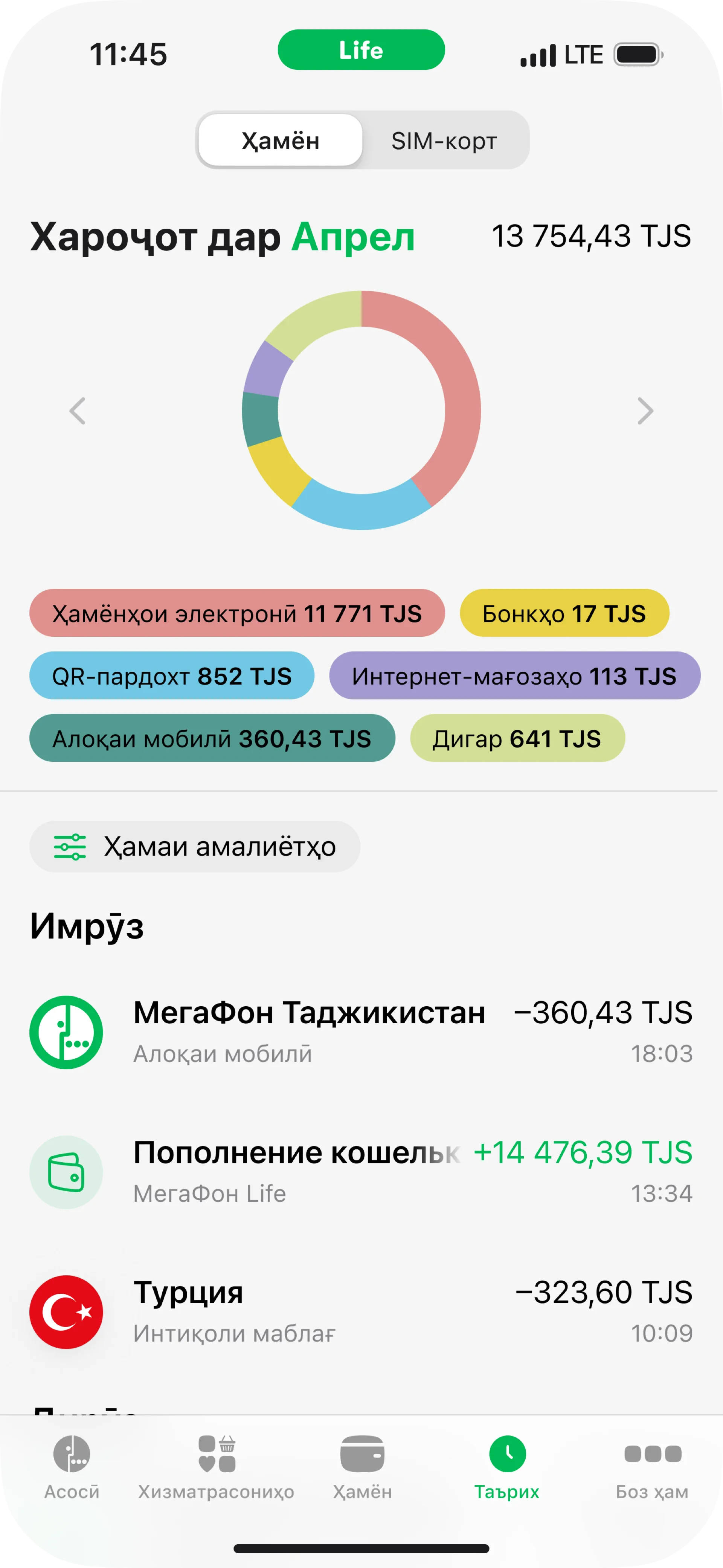Раздел истории позволяет следить за всеми финансовыми операциями с диаграммой и фильтром по категориям расходов. А также, даёт возможность создать автоплатёж.